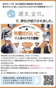 blog 週末金沢。で、弊社が紹介されました。 お知らせ 年月が経つごとに気になり始める、外壁のくすみや痛み。 「うちもそもそもリフォームどき?」と思いながらも、「どこに頼んだらいいかわからない」「高額な費用がかかりそう」と、不安でなかなか一歩が踏み出せませんよね。 そこで紹介したいのが「外壁のらいと」 確かな技術と丁寧な対応で新r内を集める、地域密着型のリフォーム会社さんなんです さっそく編集部が潜入して、相談や依頼の流れを体験してきました! ▼詳しくはこちら(週末、金沢。さんのサイトへリンク) 前の記事 一覧へ戻る