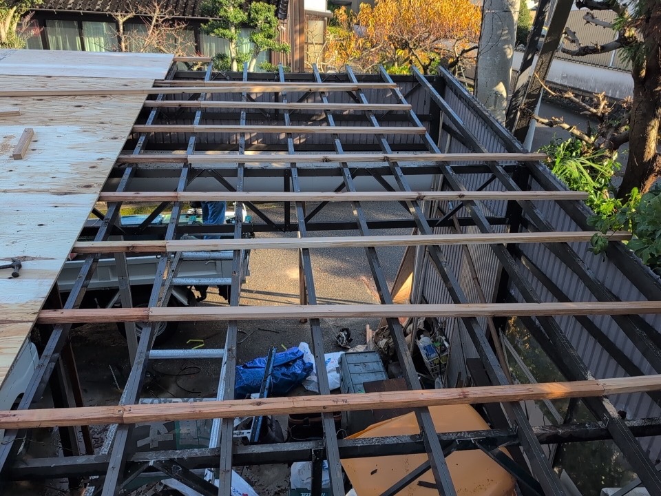 ポリカ屋根を解体し、新しい板金屋根になります。
